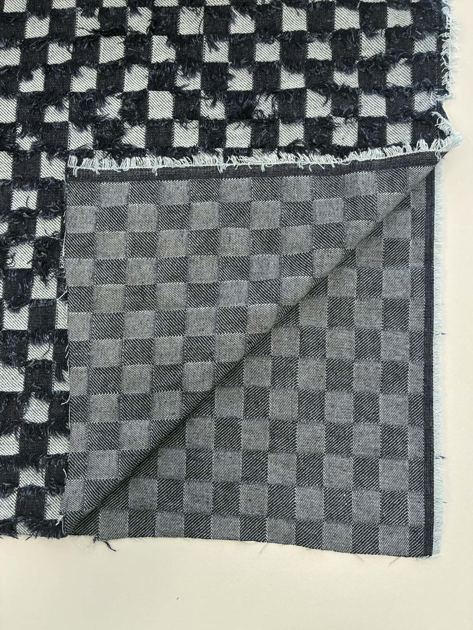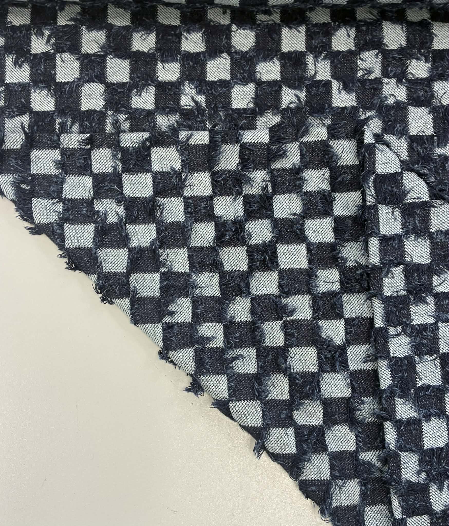 Džinsas Tamsiai mėlyni kvadtratukai. Džinsas – tai klasikinis, tvirtas ir ilgaamžis pasirinkimas, garsėjantis savo universalumu ir patogumu. Austas iš medvilnės verpalų bei papildytas elastanu, kad suteiktų judėjimo laisvę ir konfortą. Džinsas išsiskiria charakteringa tekstūrą, todėl kiekvienas gaminys įgauna unikalų stilių. Puikiai tinka kasdieniams drabužiams – nuo kelnių iki sijonų ar aksesuarų.