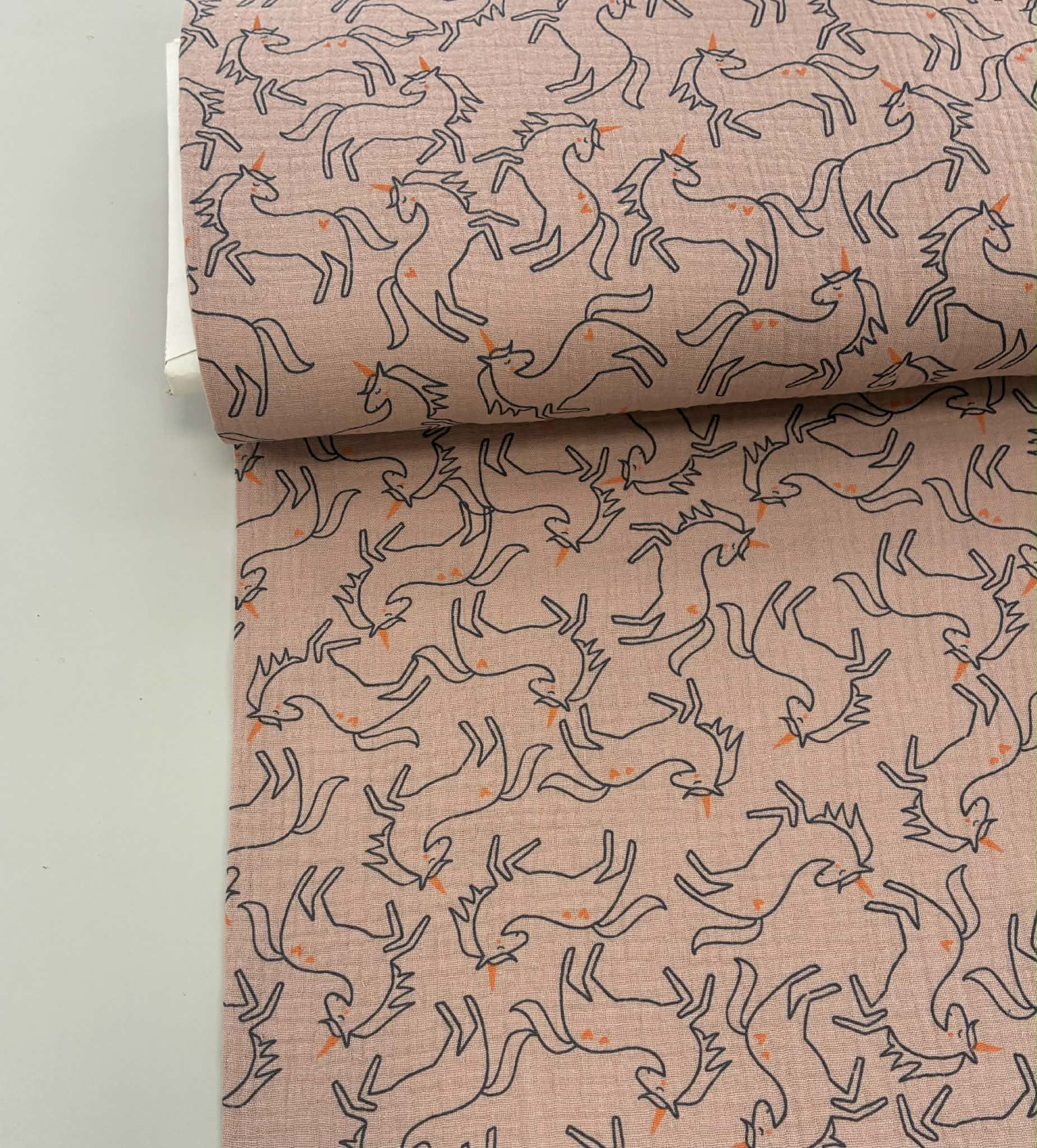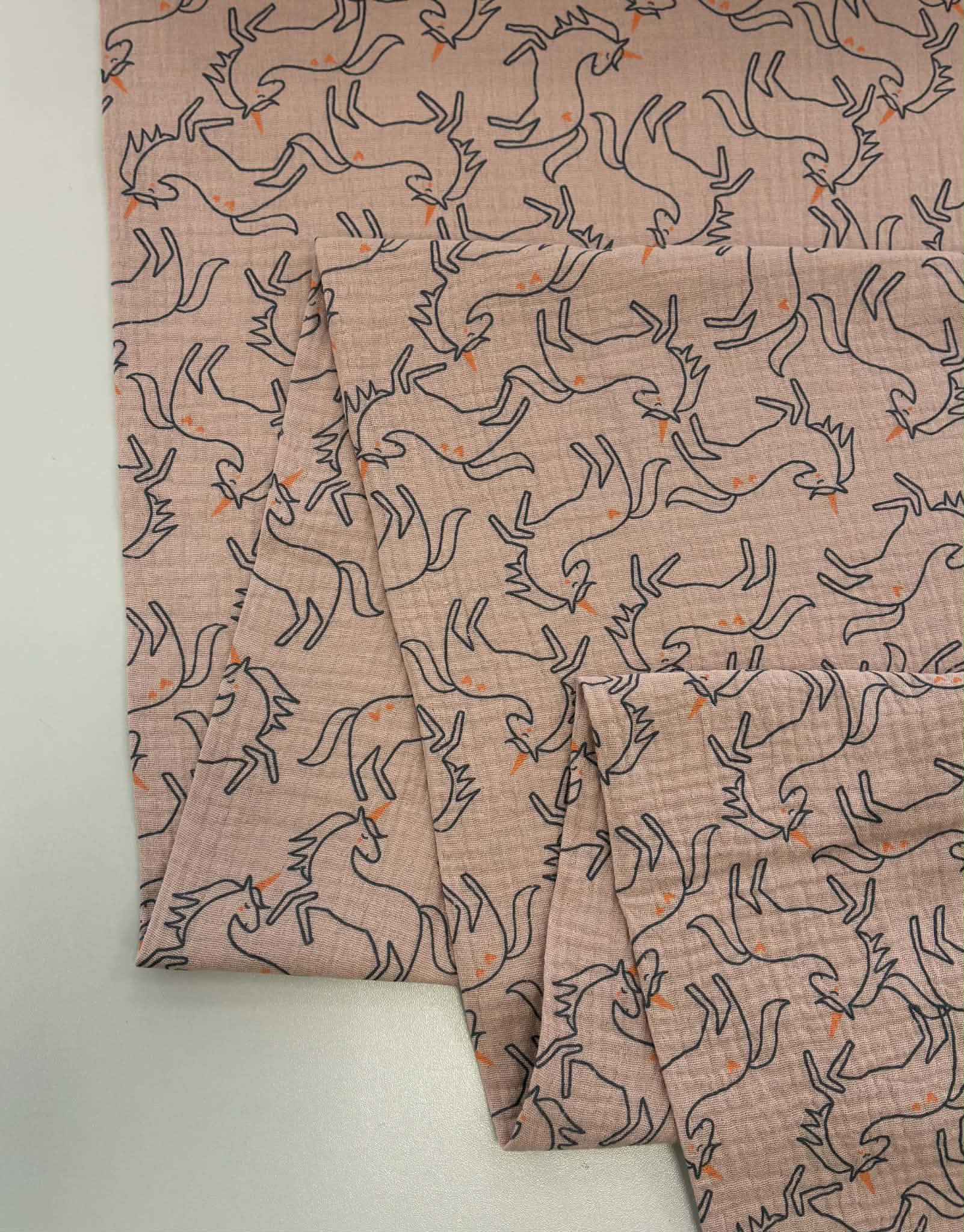 Medvilninis double gauze muslinas Pelenų rožės vienaragiai
