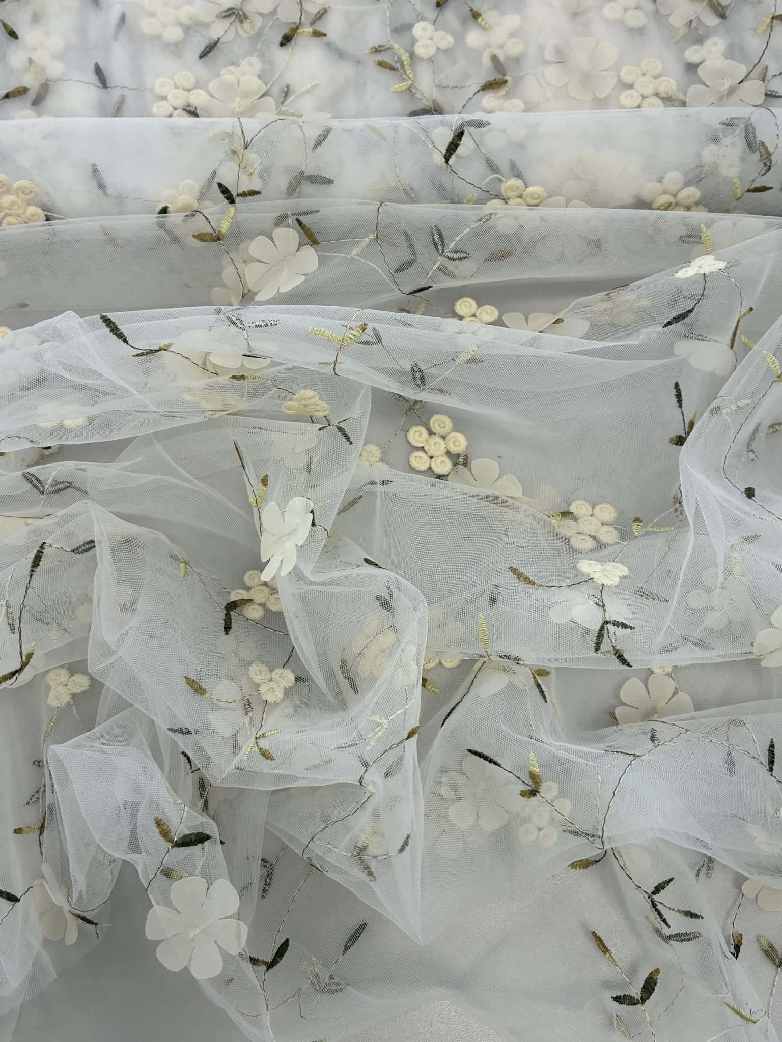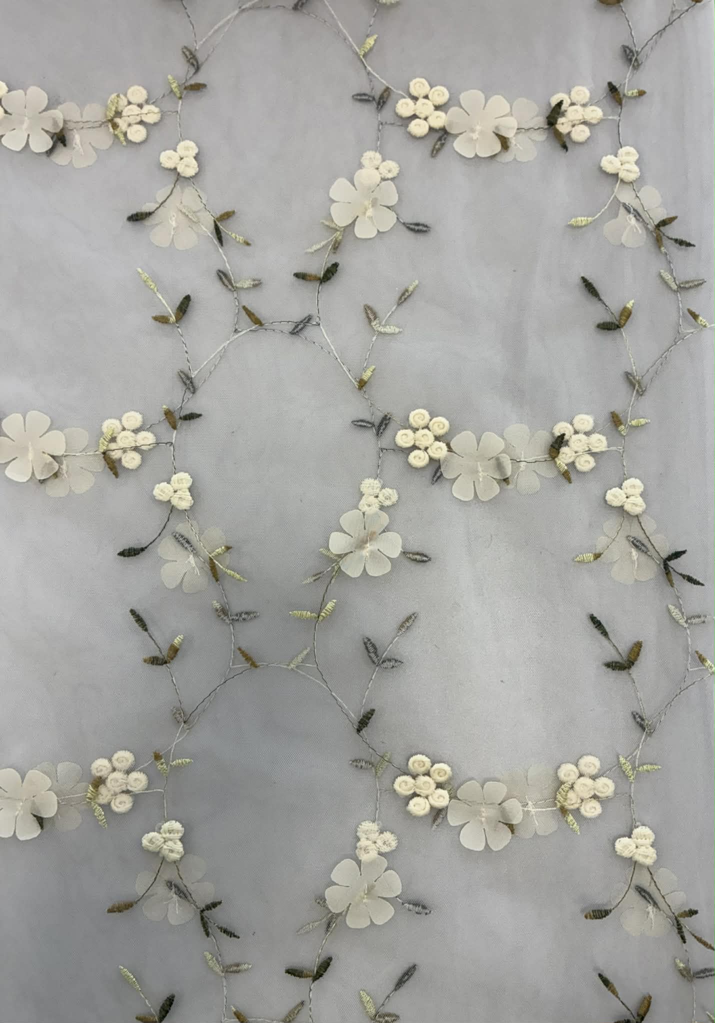 Siuvinėtas tiulis su gėlytėmis, pieno baltumo