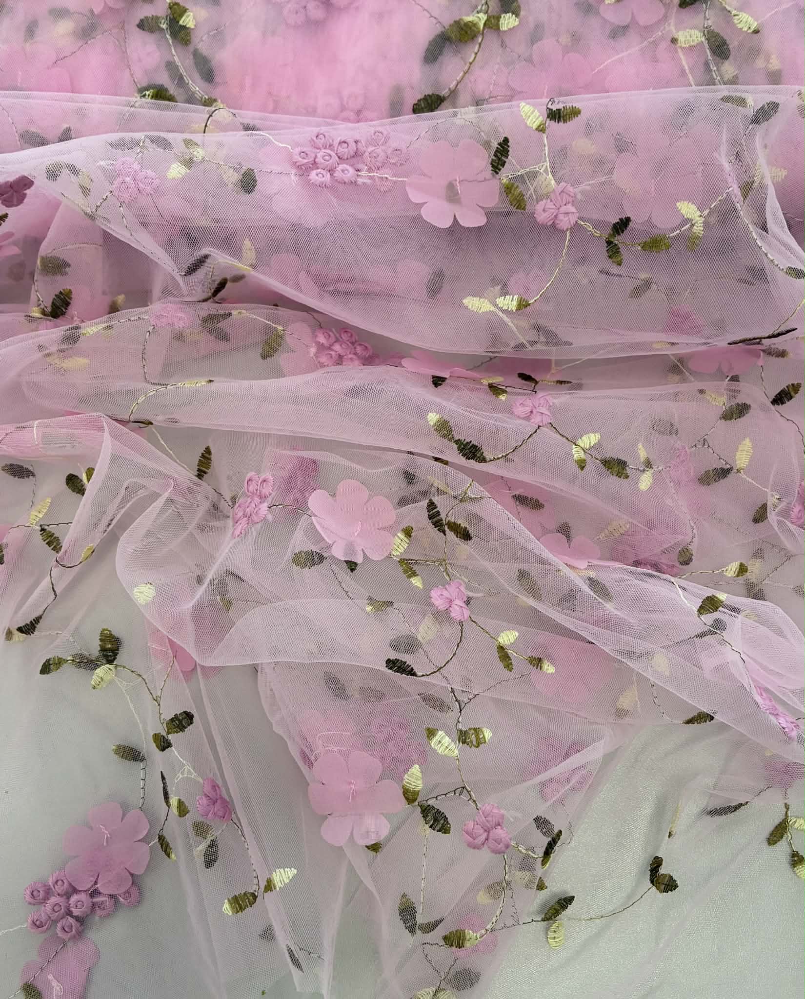 Siuvinėtas tiulis su gėlytėmis, rožinis – minkštas, labai komfortiškas, lengvas. Tiulis yra lengvas, permatomas, medvilninis ar ažūrinis tinklinis audinys arba mezginys. Kadaise jis buvo gaminamas iš šilko, bet dabar dažniausiai jo gamybai panaudojamos sintetinės medžiagos, tokios kaip poliesteris. Tiulis būna įvairaus minštumo ir tankumo. Kai kurios rūšies tiulis būna labiau perregimas, kitos – mažiau. Minkštas tiulis puikiai tinka suknelėms, sijonams, nuometams, pasijoniams, bodžiams siūti, dekoruoti palaidinukėms ar kitiems rūbeliams; kėdžių, stalų, langų, šventinių vietų, salių papuošimams. Juo gali būti puošiami moteriški ar vaikiški rūbai, apatiniai. Iš jo galima siūti lengvas, permatomas užuolaidas, užtiesalus. Tiulis būna įvairių spalvų. Baltas tiulis ypatingai tinka puošti nuotakų rūbams, iš jų siuvami nuometai. Tinka dekoruoti ar siūti krikšto rūbelius tiek berniukams, tiek mergaitėms. Lengvai lankstomas, galima siūti, klijuoti, tinkamas įvairiems rankdarbiams ir siuviniams.