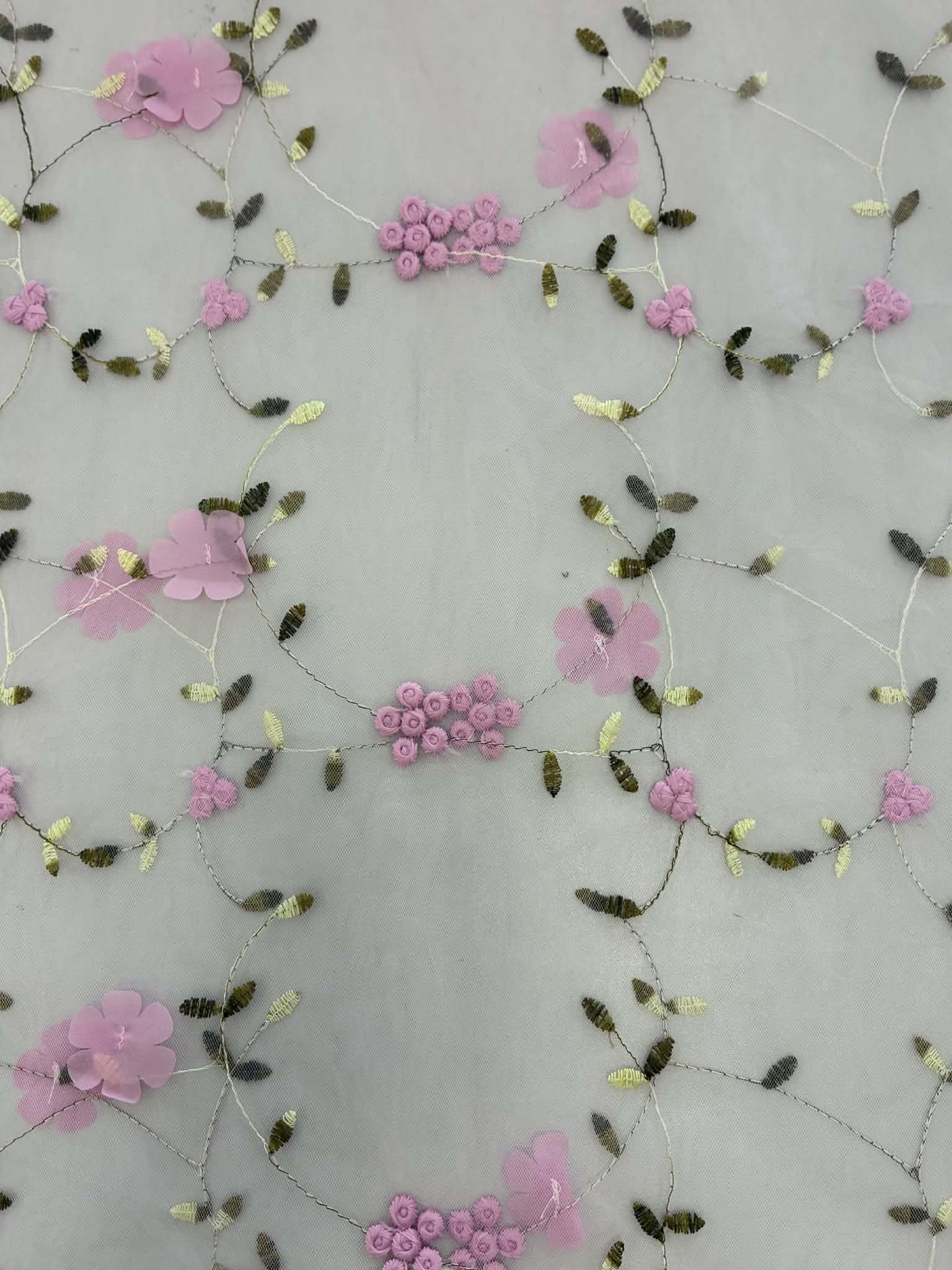 Siuvinėtas tiulis su gėlytėmis, rožinis