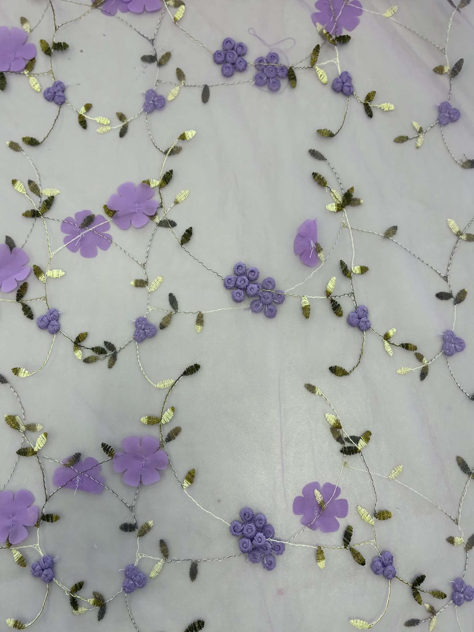 Siuvinėtas tiulis su gėlytėmis, violetinis – minkštas, labai komfortiškas, lengvas. Tiulis yra lengvas, permatomas, medvilninis ar ažūrinis tinklinis audinys arba mezginys. Kadaise jis buvo gaminamas iš šilko, bet dabar dažniausiai jo gamybai panaudojamos sintetinės medžiagos, tokios kaip poliesteris. Tiulis būna įvairaus minštumo ir tankumo. Kai kurios rūšies tiulis būna labiau perregimas, kitos – mažiau. Minkštas tiulis puikiai tinka suknelėms, sijonams, nuometams, pasijoniams, bodžiams siūti, dekoruoti palaidinukėms ar kitiems rūbeliams; kėdžių, stalų, langų, šventinių vietų, salių papuošimams. Juo gali būti puošiami moteriški ar vaikiški rūbai, apatiniai. Iš jo galima siūti lengvas, permatomas užuolaidas, užtiesalus. Tiulis būna įvairių spalvų. Baltas tiulis ypatingai tinka puošti nuotakų rūbams, iš jų siuvami nuometai. Tinka dekoruoti ar siūti krikšto rūbelius tiek berniukams, tiek mergaitėms. Lengvai lankstomas, galima siūti, klijuoti, tinkamas įvairiems rankdarbiams ir siuviniams.