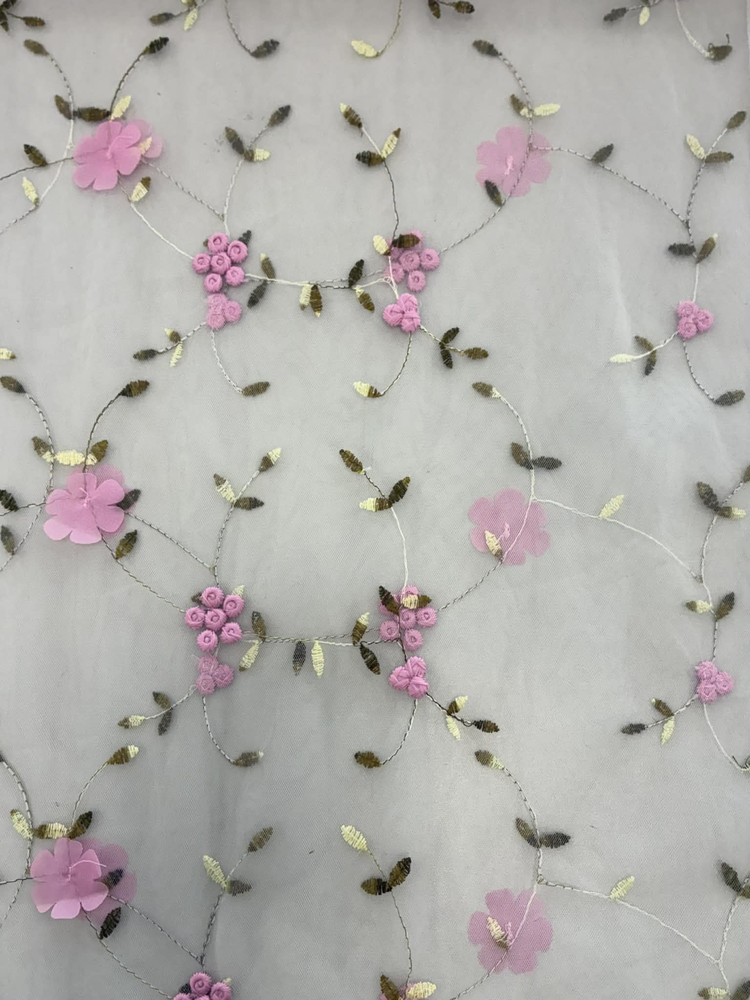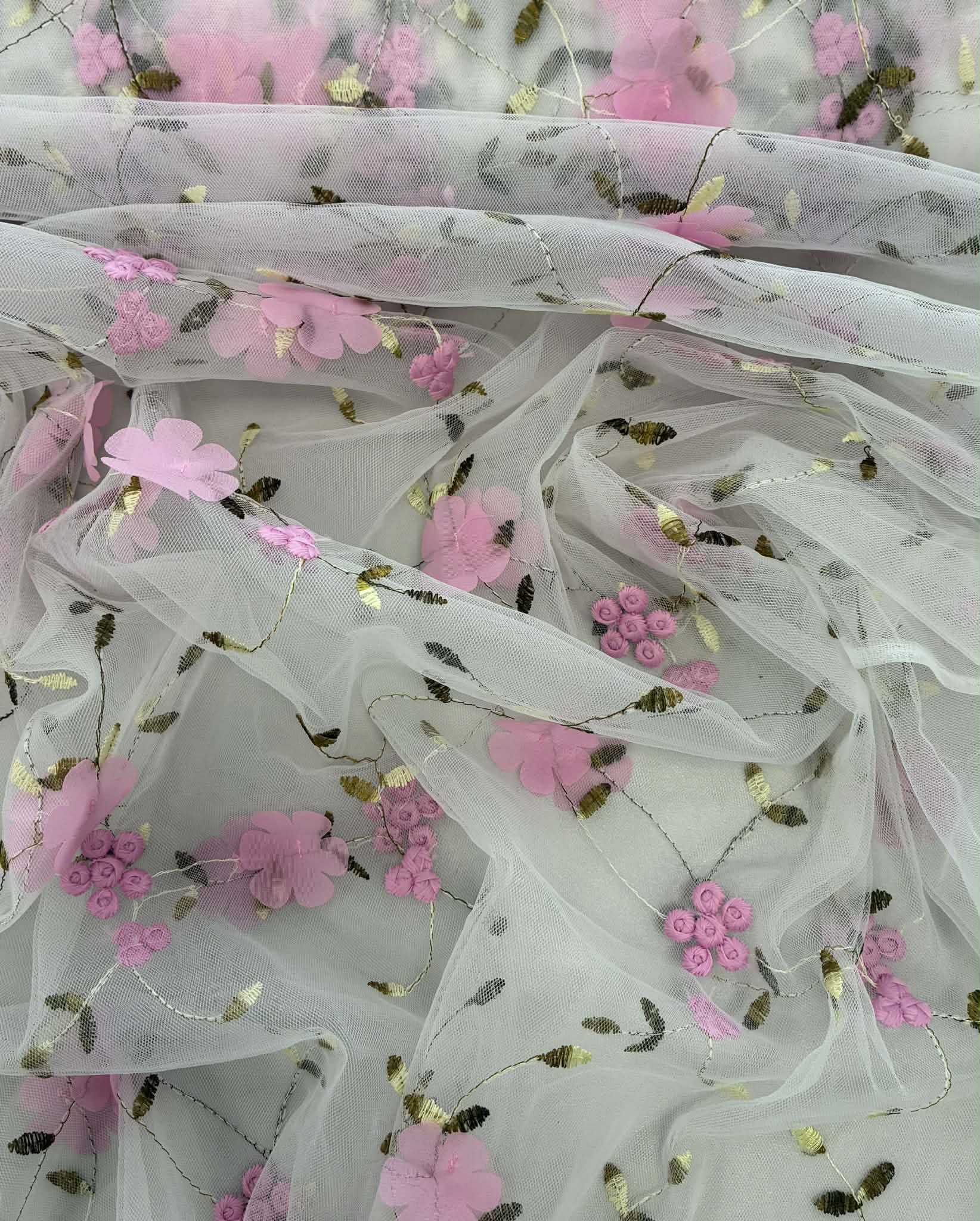 Siuvinėtas tiulis su rožinėmis gėlytėmis, pieno baltumo